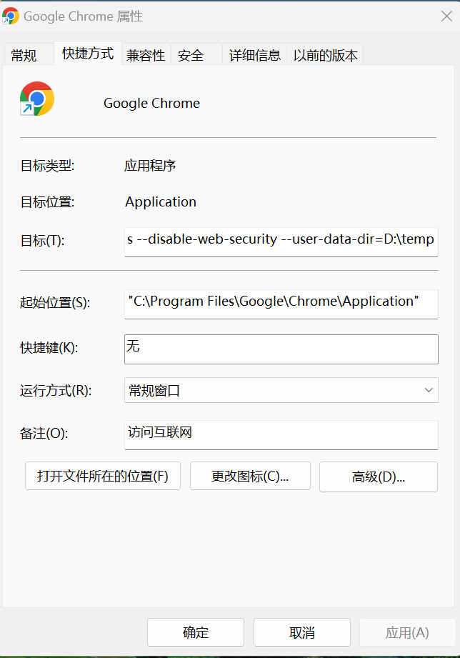 在本地开发和服务器接口调试时,如何跨域进行访问呢?在浏览器快捷键上点击右键,在目标输入框的最后加上下面的代码 就大功告成! --args --disable-web-security --user-data-dir=D:\temp