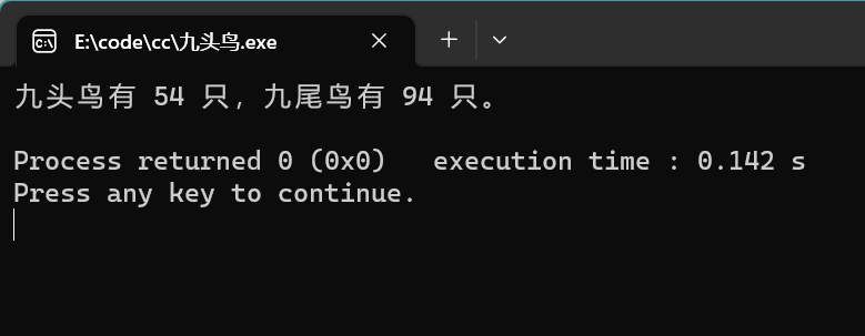 cout << "九头鸟有 " << num_nine_head_birds << " 只,九尾鸟有 " << num_nine_tail_birds << " 只。" << endl;