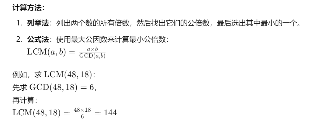 公式法,通过最大公因数来计算最小公倍数:LCM(a,b)=a×bGCD(a,b)\text{LCM}(a, b) = \frac{a \times b}{\text{GCD}(a, b)}LCM(a,b)=GCD(a,b)a×b