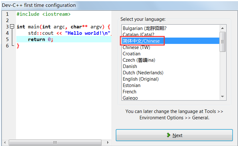 1) 第一次启动 Dev C++ 后,提示选择语言。