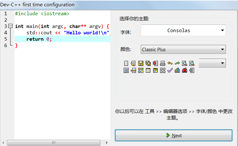 首次使用 Dev C++ 需要简单的配置,包括设置语言、字体、和主题风格。