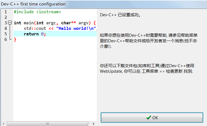3) 提示设置成功:点击“OK”按钮,进入 Dev C++,就可以编写代码了。