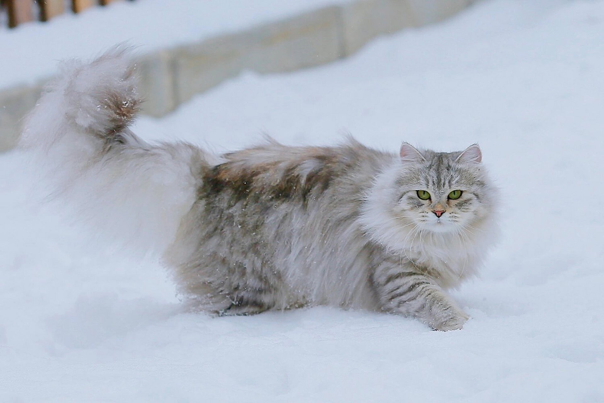西伯利亚森林猫的耳朵中等大小,外形尖长,耳尖上常常有一簇毛发,显得既可爱又富有野性。它们的大眼睛通常呈现明亮的绿色、黄色或金色,眼神深邃且聪明。它们的尾巴长而蓬松,充满力量,能够帮助它们在极寒天气下保持平衡。