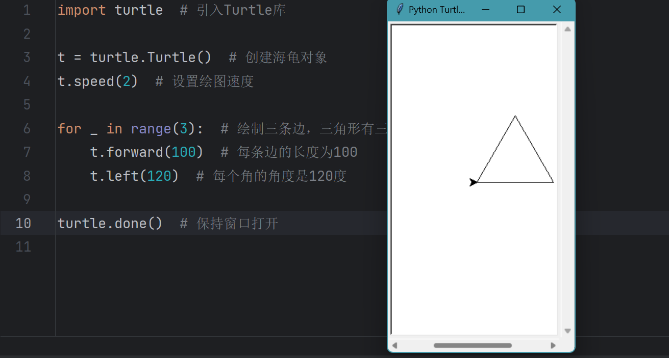for _ in range(3):我们用for循环来绘制三条边,每条边的长度是100,循环3次,代表三角形的三条边。t.forward(100):海龟向前走100步,绘制三角形的边。t.left(120):海龟每走一条边,就左转120度。为什么是120度呢?因为三角形的内角是60度,所以为了让角度合适,每次转动120度就能形成等边三角形。