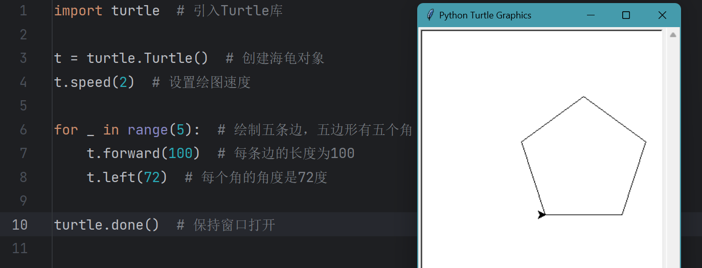 for _ in range(5):我们使用for循环重复绘制五条边,每条边的长度是100。t.forward(100):海龟前进100步,绘制每一条边。t.left(72):每绘制一条边,海龟转动72度,形成五边形的角度。